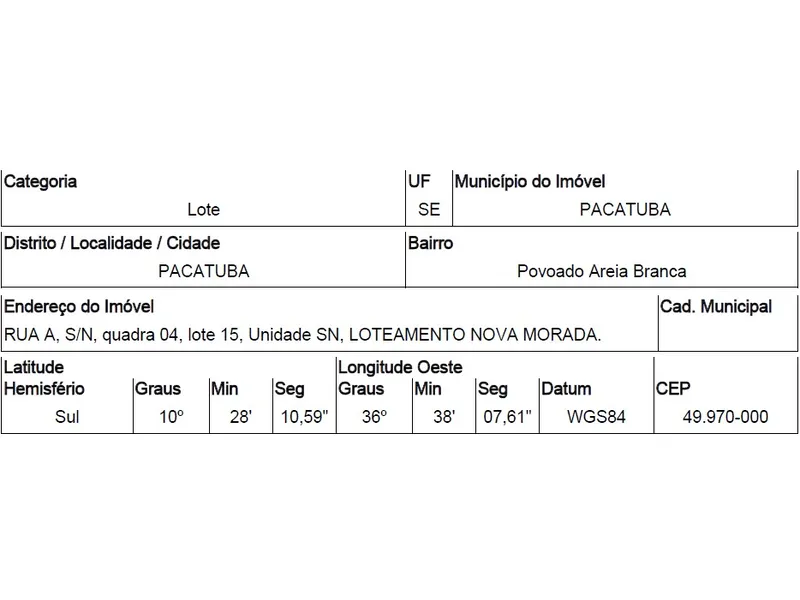 RUA A,N. 00 QD 04, LT 15, POVOADO AREIA BRANCA - CEP: 49970-000, PACATUBA - SERGIPE